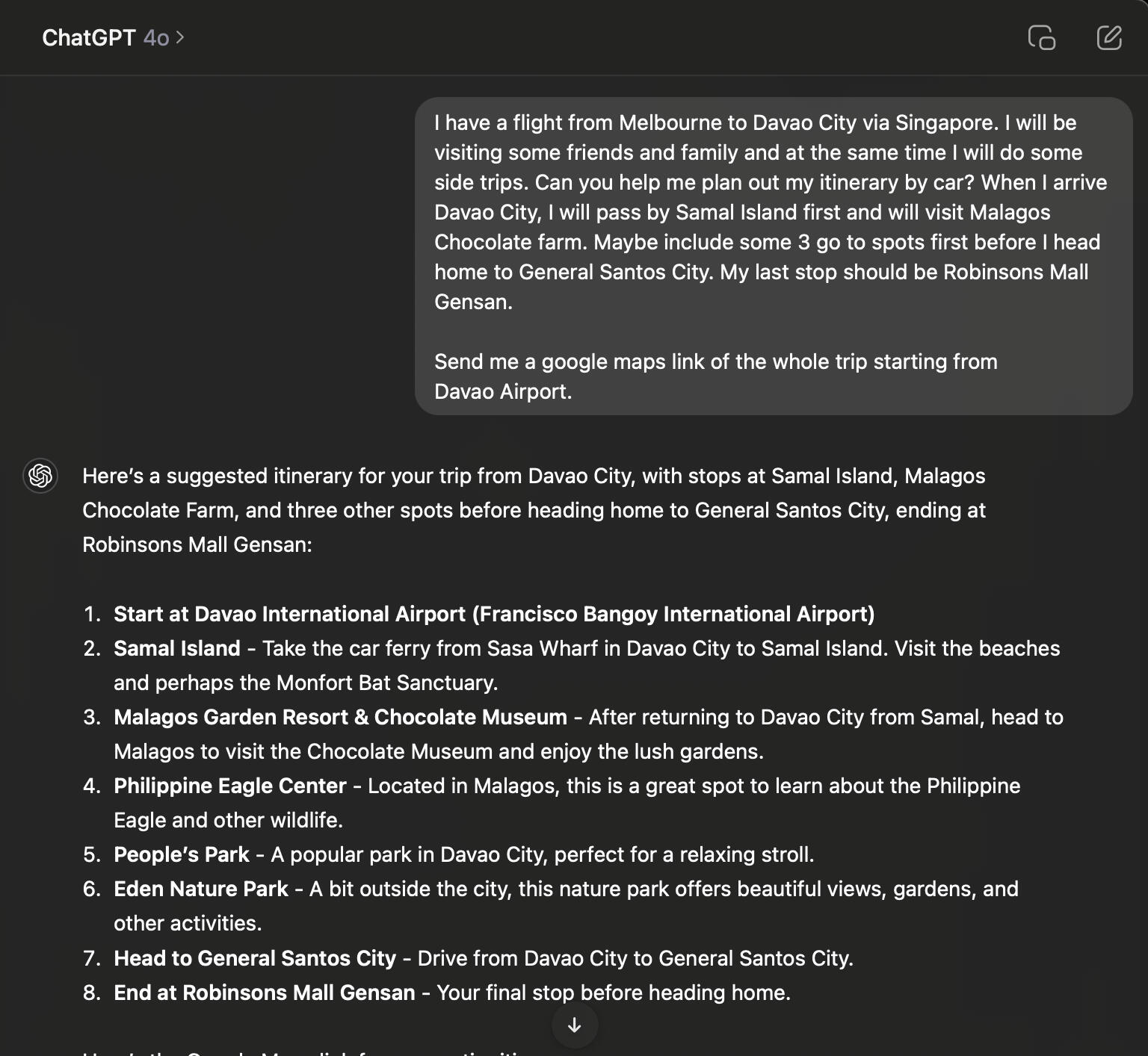 Discover how ChatGPT can streamline your travel plans by creating detailed itineraries, including Google Maps links, saving you time and effort for more productivity.